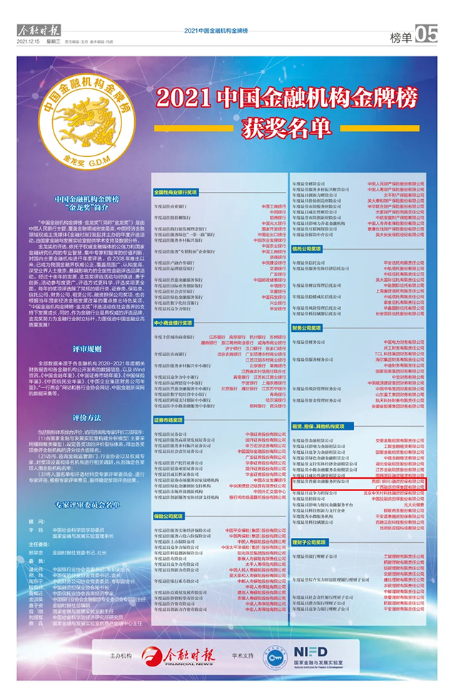 “中國金融機(jī)構(gòu)金牌榜·金龍獎”是《金融時報》自2008年推出的全國性重要金融評選品牌,已成為中國金融界權(quán)威公正、覆蓋范圍廣、認(rèn)知度高、深受業(yè)界人士推崇、最具影響力和公信力的全國性金融品牌評選活動。今年是“金龍獎”評選的第十四屆,此次由國家金融與發(fā)展實(shí)驗(yàn)室提供學(xué)術(shù)支持,由業(yè)內(nèi)權(quán)威專家學(xué)者組成專家評審委員會,共評出80余個獎項(xiàng)。其中,西部擔(dān)保是第六年榮獲該獎項(xiàng)。