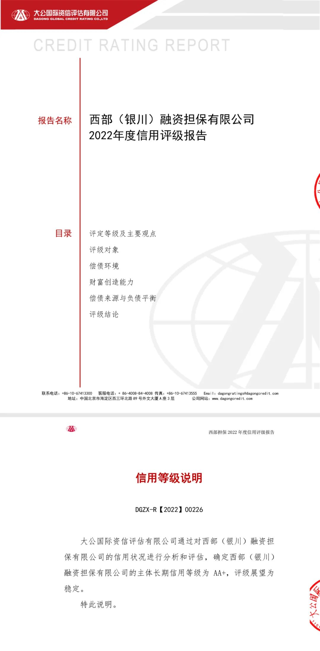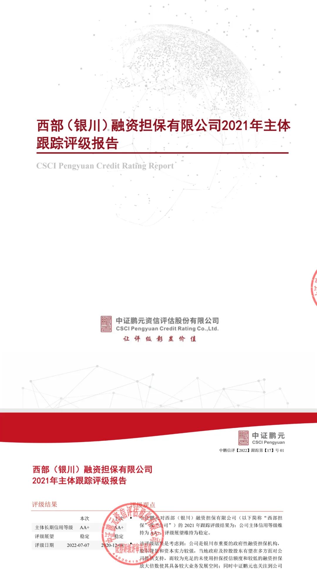 近日,國內(nèi)權(quán)威信用評(píng)級(jí)機(jī)構(gòu)大公國際資信評(píng)估有限公司、中證鵬元資信股份有限公司相繼完成了對(duì)西部擔(dān)保2021年度主體信用評(píng)級(jí)續(xù)評(píng)工作,維持主體信用等級(jí)為“AA+”、評(píng)級(jí)展望為“穩(wěn)定”。該評(píng)級(jí)結(jié)果體現(xiàn)了市場(chǎng)對(duì)西部擔(dān)保綜合實(shí)力、經(jīng)營(yíng)情況的客觀評(píng)定。