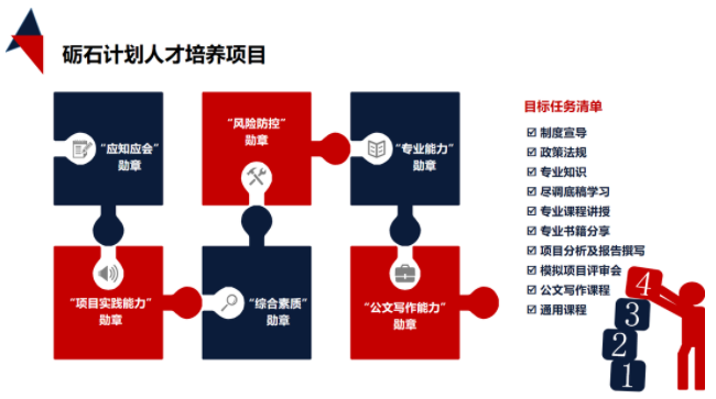 為持續(xù)優(yōu)化公司分層級(jí)人才培養(yǎng)機(jī)制,落地接班人計(jì)劃,結(jié)合公司發(fā)展戰(zhàn)略立足人才發(fā)展需要, 2022年,公司啟動(dòng)了“礪石計(jì)劃”——項(xiàng)目經(jīng)理人才培養(yǎng)項(xiàng)目。該計(jì)劃是公司對(duì)項(xiàng)目經(jīng)理層員工打造的一款標(biāo)準(zhǔn)化、產(chǎn)品化人才培養(yǎng)項(xiàng)目,通過(guò)建立榮譽(yù)勛章獎(jiǎng)懲體系、配備直線輔導(dǎo)人、設(shè)置“任務(wù)清單+動(dòng)態(tài)管理”的模式,敦促并跟進(jìn)項(xiàng)目經(jīng)理完成各項(xiàng)任務(wù)并達(dá)到考核標(biāo)準(zhǔn),方可成為一名合格的項(xiàng)目經(jīng)理?!暗Z石計(jì)劃”實(shí)施中重點(diǎn)結(jié)合工作實(shí)踐,設(shè)立有針對(duì)性培訓(xùn)課程,全面加強(qiáng)項(xiàng)目經(jīng)理人流程搭建、財(cái)務(wù)分析、風(fēng)險(xiǎn)防控、行業(yè)研究、項(xiàng)目研判等專業(yè)素質(zhì),提升獨(dú)立承做業(yè)務(wù)能力,挖掘其內(nèi)在潛能,夯實(shí)基本功,打造懂企業(yè)、善分析、能落地的優(yōu)秀項(xiàng)目經(jīng)理人,使個(gè)人發(fā)展與公司發(fā)展緊密協(xié)同,保證公司人才庫(kù)動(dòng)態(tài)管理,支持公司創(chuàng)新發(fā)展。